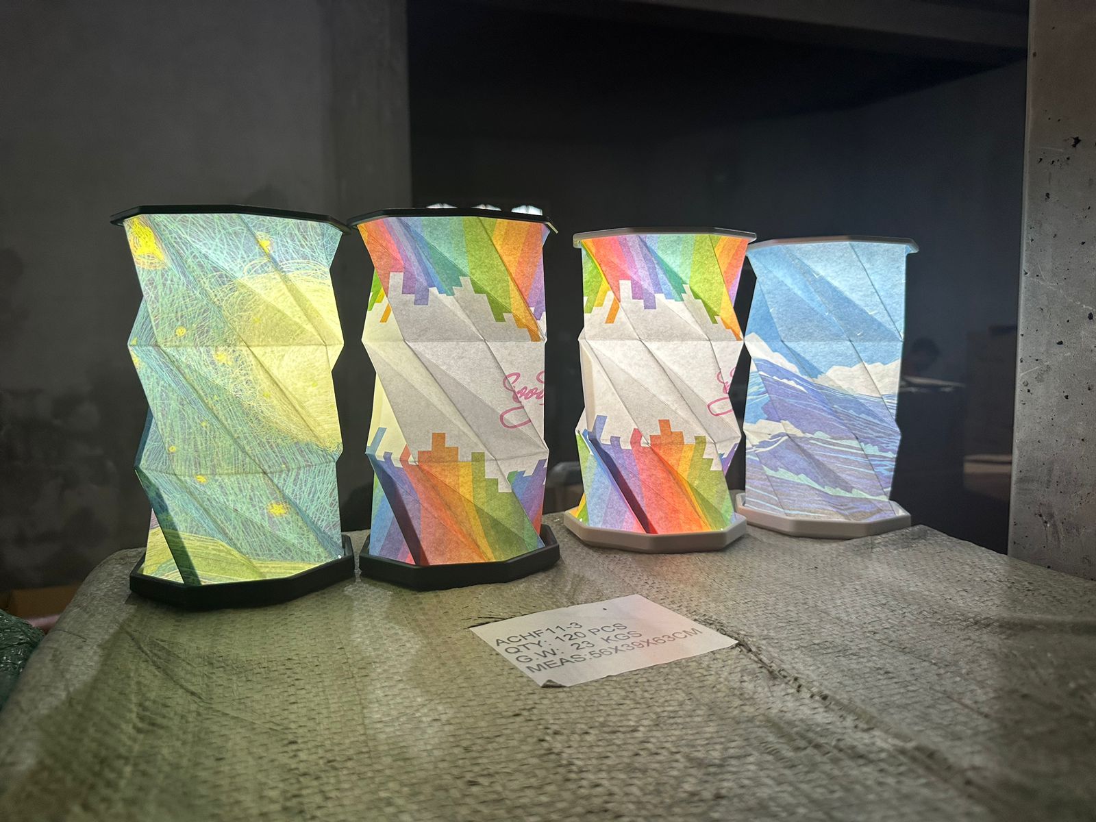 lanternes décoratives pliables, de type lanterne en papier ou en tissu, avec des motifs variés et colorés