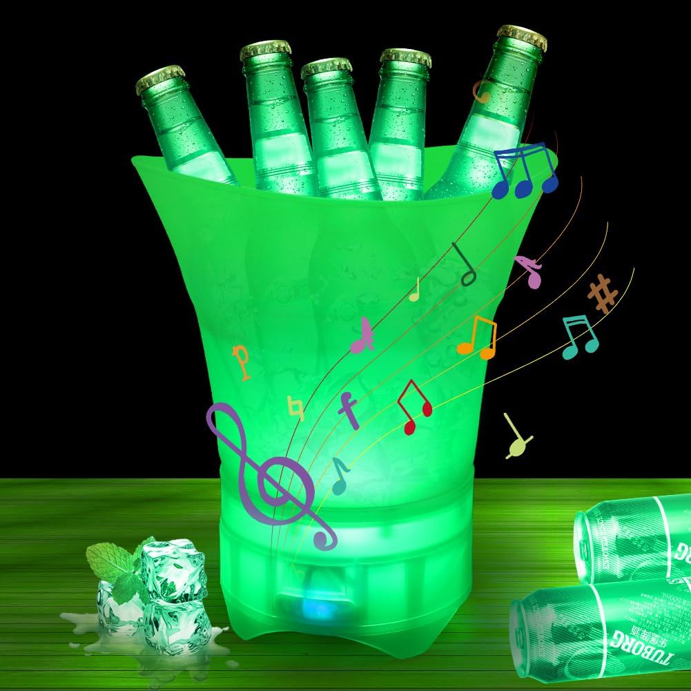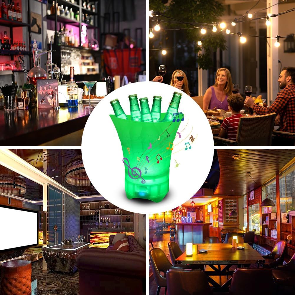 Seau à glace multifonction équipé d’un système LED à changement de couleurs et d’un haut-parleur Bluetooth intégré. Idéal pour garder vos bouteilles de champagne, vin ou bière bien fraîches tout en créant une ambiance festive.